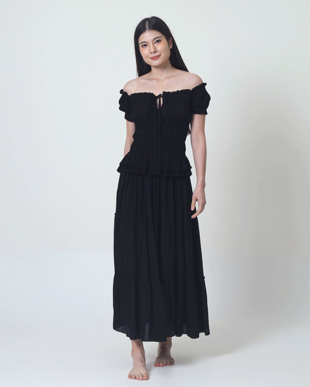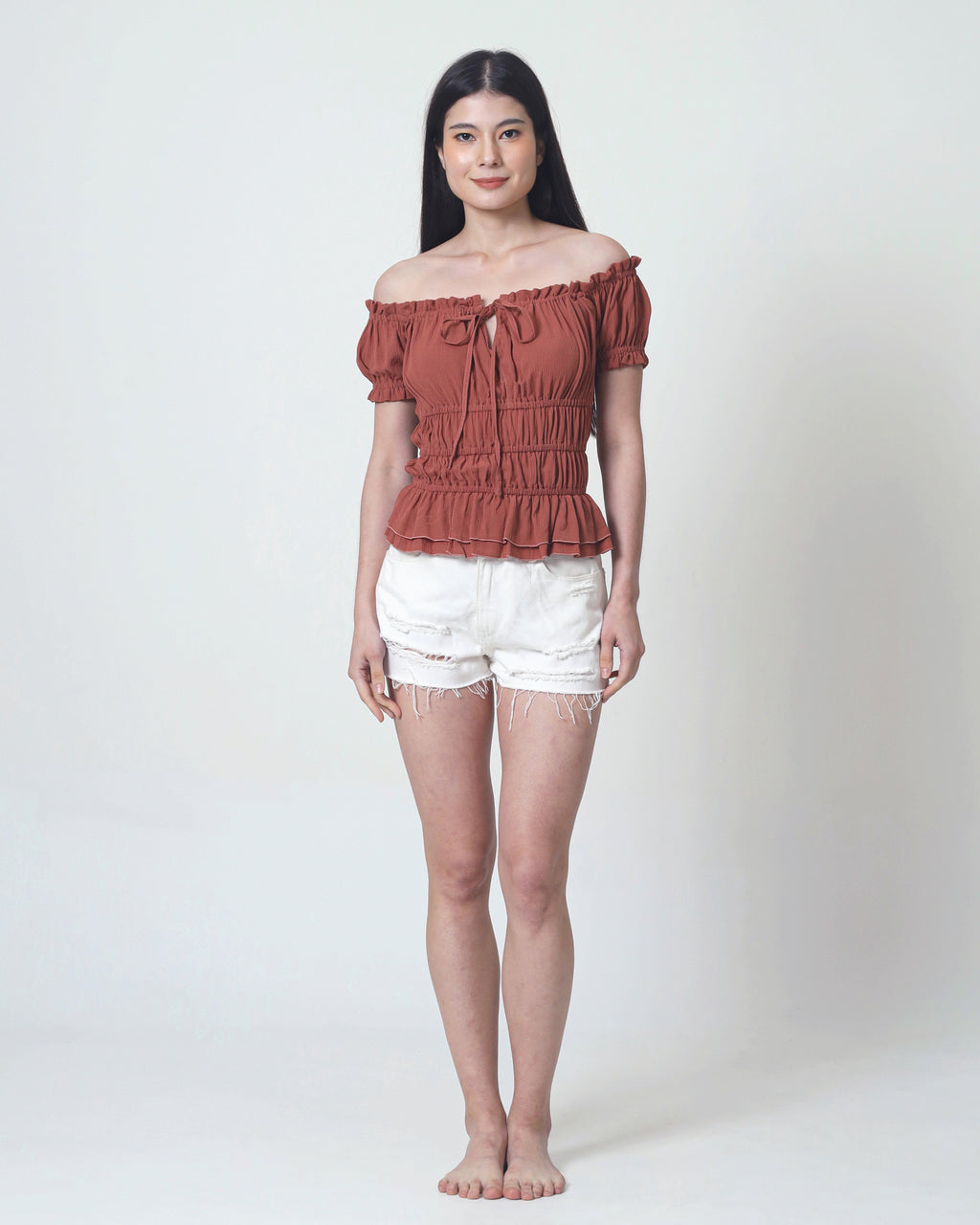 Cinabrio is a versatile off-shoulder top featuring adjustable shoulder straps that can be worn multiple ways. Style it with shoulders fully exposed for a classic off-shoulder look, or shift the straps to the side for a modern asymmetrical silhouette. Delicate chest ties add definition and allow you to customize the fit to your preference. Perfect for creating effortless, fashion-forward outfits with minimal effort.Handmade By Pina Colada