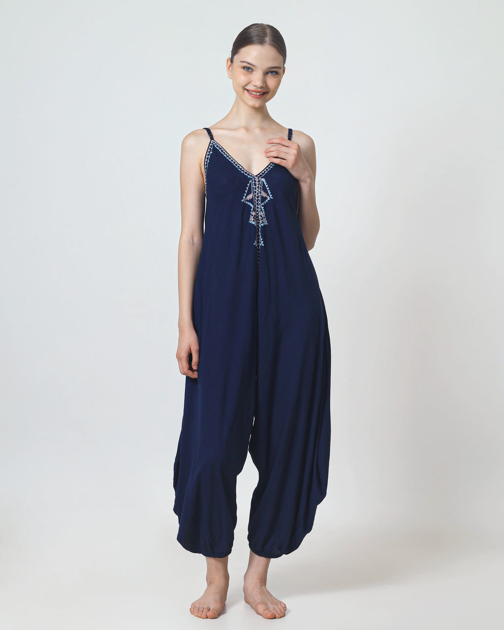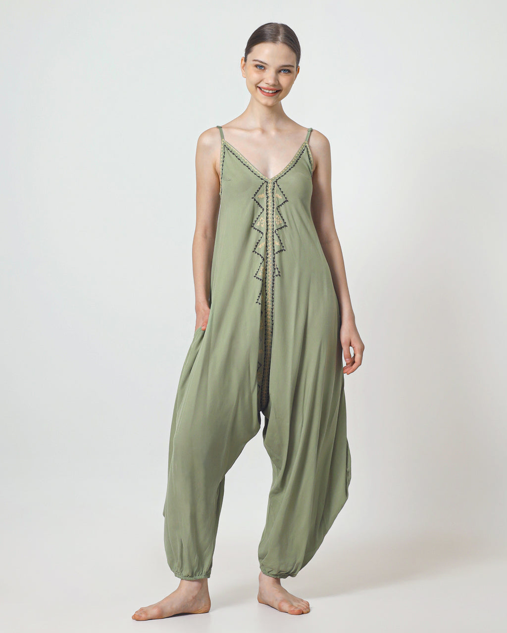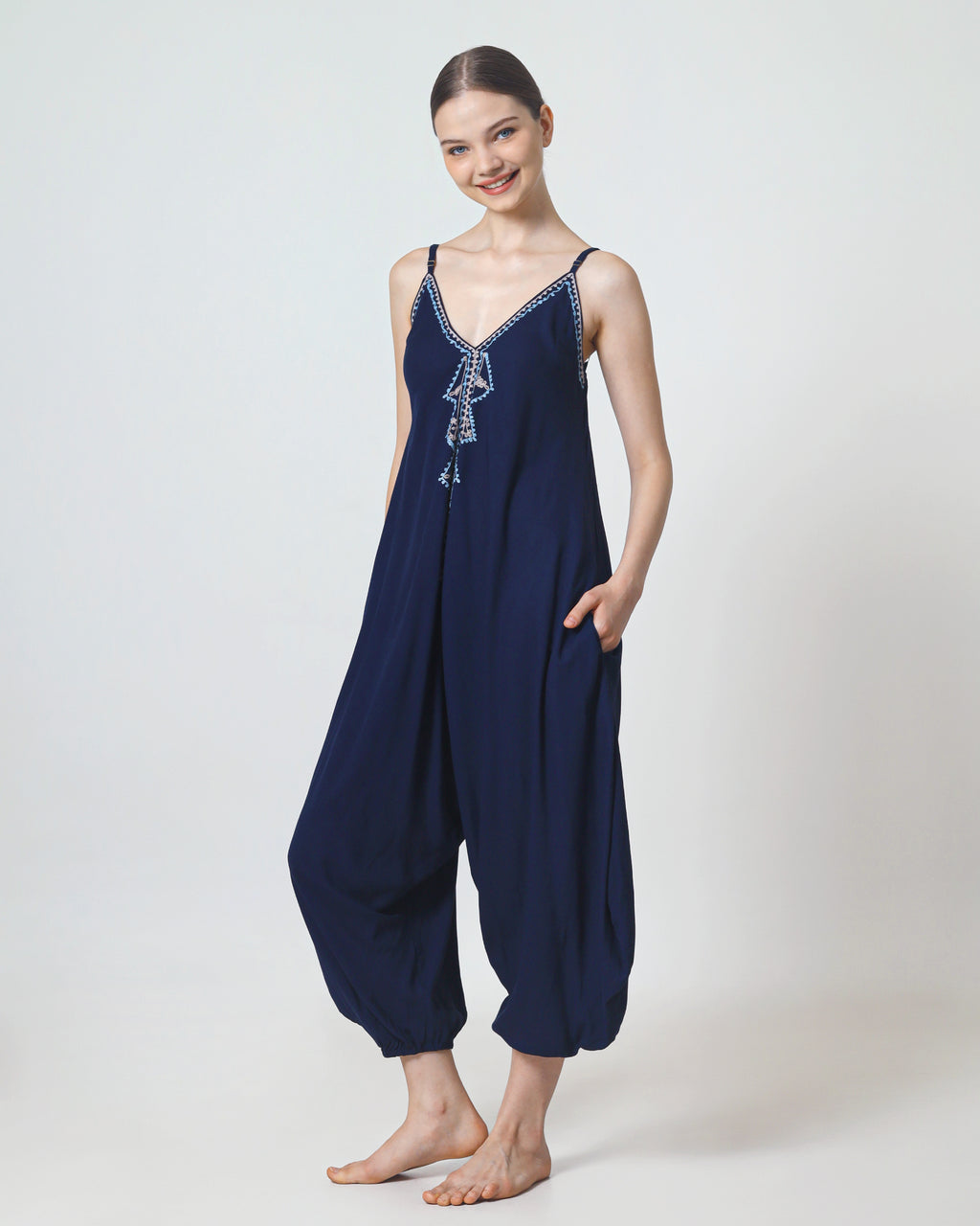 The Hidya jumpsuit delivers exceptional comfort with its soft fabric and ergonomic design. Adjustable straps offer flexibility to fit your body shape perfectly. Delicate embroidery detail in the center adds an elegant touch while enhancing the overall aesthetic, making it an ideal choice for various occasions.Handmade By Pina Colada