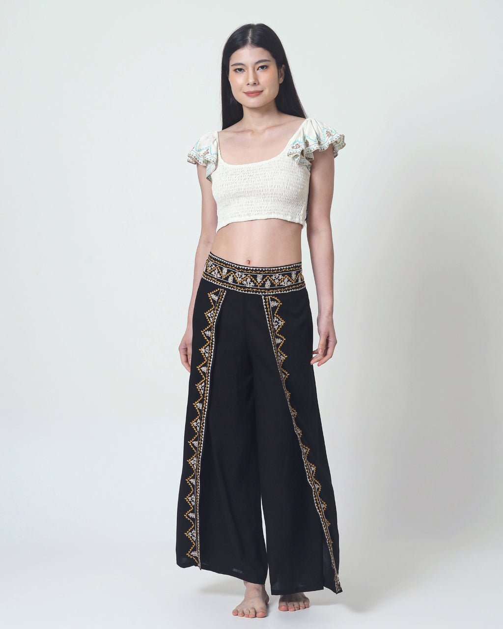 This Sol crop top features a fitted elastic design that contours comfortably to your body. Its short sleeves are adorned with delicate embroidery, adding a subtle yet sophisticated touch that elevates your overall look. Perfect for those seeking both style and a flattering fit in one chic piece.Handmade By Pina Colada